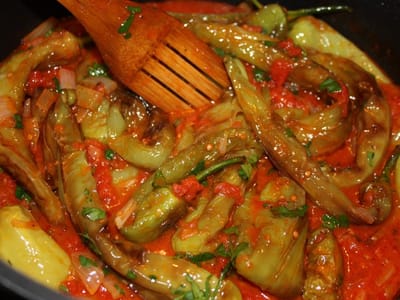 Червените и зелените чушки се измиват, почистват се от семките, изпичат се и се обелват. Поръсват се със сол, потапят се в брашното и се изпържват в загрято олио. Готовите чушки се подреждат в голяма чиния за сервиране и се заливат с приготвения топъл доматен сос. Той се приготвя от изброените продукти, като доматите се запържват в олиото, брашното се разтваря в малко вода, сипва се в соса и се добавят подправките. Накрая в соса се слага чесънът, нарязан на ивички. Поръсва се със ситно нарязания магданоз.