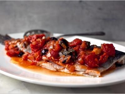 Почистваме и измиваме рибите. Натриваме ги отвътре и отвън с черен пипер и сол. Слагаме ги в намаслена тавичка. Заливаме с доматеното пюре, размито в малко водичка и с доматите от консерва, разполовени на две. Добавяме дафиновите листа, скилидките чесън, маслините и краставичките, нарязани на кръгчета.