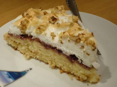 През това време с миксера разбиваме белтъците и захарта, докато станат на сняг. Готовият блат се намазва обилно със сладкото. Най-отгоре се разстилат и разбитите белтъци. Така приготвения сладкиш се връща обратно във фурната, докато белтъците порозовеят.